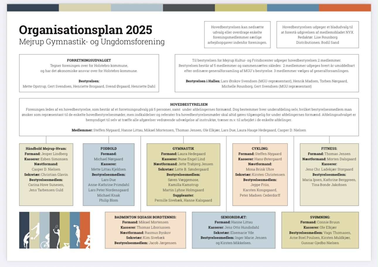 Måske er du ny i Mejrup eller måske sidder du og tænker, hvordan er det lige det hele hænger sammen i MGU. Det kan du blive lidt klogere på efter endt læsning af dette skriv. I MGU foregår meget synligt arbejde, men ”bag facaden” lægger mange mennesker også kræfter i det ”usynlige” arbejde, der sikrer hele driften af MGU. MGU er oprettet som forening i 1966.